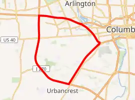 The Hilltop is bounded by Interstate 70 in the north, the CSX railroad on the east, and Interstate 270 on the south and west.[9] The Hilltop includes part or all of ZIP Codes 43204, 43222, 43223, 43123 and 43228. Its main thoroughfares are West Broad Street (U.S. Route 40) - Mound Street, and Hague Avenue.[10] Within these bounds there are several jurisdictions including the city of Columbus, the city of Urbancrest, the village of Valleyview, Franklin County, Franklin Township, Jackson Township and Prairie Township. This area covers approximately 9,917 acres. Just east of this area is a neighborhood by the name of Franklinton.[11] The name, "The Greater Hilltop", indicates an opportunity for the community to help shape and direct the pattern of growth and the character of future development in the neighborhood.[12]