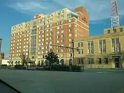 The Hilton Garden Inn is a 120-foot 11 story high-rise hotel in the downtown Cleveland Gateway District.[1] It is postmodern in style and has a color scheme of light red and beige. The Hilton is very squat in structure and occupies over a city block of space length wise, however, width wise it is very thin. It is connected to the Gateway Conference Center. The hotel features 240 rooms and sits directly across the street from Progressive Field which is the home of the Cleveland Indians.[2] It opened in 2002.[3] It was one of the first major new hotels constructed in the central city area of downtown in the new millennium. It is one of four Hilton hotels in Cleveland, the other four being the Hilton Cleveland Downtown Hotel, the Double Tree Hotel Cleveland, and the Hampton Inn (Cleveland).