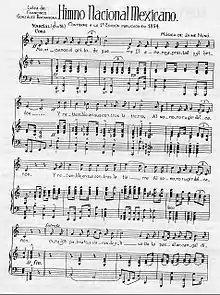The "Mexican National Anthem" (Spanish: Himno Nacional Mexicano, Nahuatl languages: Mexihcaletepetlacuicalt[1]), also known by its incipit "Mexicans, at the cry of war" (Spanish: Mexicanos, al grito de guerra), is the national anthem of Mexico. The anthem was first used in 1854. The lyrics of the national anthem, which allude to historical Mexican military victories in the heat of battle and including cries of defending the homeland, were composed by poet Francisco González Bocanegra after a Federal contest in 1853. Later, in 1854, he asked Jaime Nunó to compose the music that now accompanies González's poem. The national anthem, consisting of ten stanzas and a chorus, effectively entered into use on September 16, 1854.