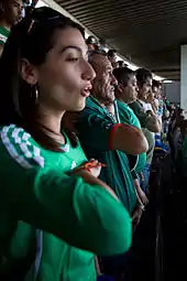 Mexican fans sing the Mexican national anthem before a football match in March 2009.