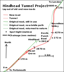 By 2000 the A3 between Southfields and Havant had been built to dual carriageway standards for its entire length apart from the 5.5 km (3.4 miles)[9] Hindhead section (there are still sections of single carriageway within London and Portsmouth). The termini of the northern and southern sections of dual carriageway were at altitudes of 180 m (590 ft) and 190 m (620 ft) above sea level respectively and the single carriageway linking them followed a winding route around the Devil's Punch Bowl, reaching an altitude of 260 m (850 ft). The Hindhead Tunnel project shortened the route by about 300 m (980 ft) and routed the road through a tunnel whose northern and southern portals are at altitudes of 190 m (620 ft) and 200 m (660 ft) above sea level respectively.