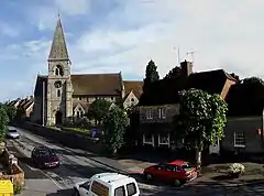 In 1804 the church (known as the Free Chapel)[6] comprised a nave and chancel with a south tower, the lower part of which served as a porch. The tower and possibly part of the nave and chancel dated from the 12th century, while the west doorway and window and a south window of the nave were later medieval. In 1836 the church was enlarged: a north aisle was added, as well as a window in the nave; by 1864 marriages were being performed in the church. However, this incarnation of the church was short-lived. Parish status was assigned in 1869[6] and in November of that same year the Free Chapel was demolished, along with a few adjacent buildings, to make way for a new church. By July 1871, construction was completed, and the new parish church of St John the Baptist, designed by T. H. Wyatt, was consecrated. This survives largely unaltered.