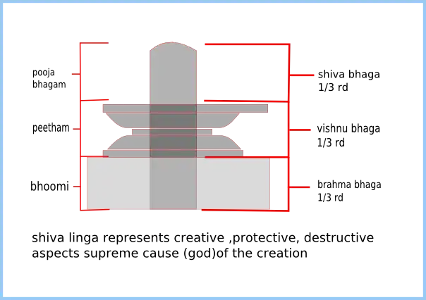 The sacred texts describe many types of shiva linga based on variations in the proportions. The following is the description of sarvatobhadra shiva lingam preferably constructed in black spotless hard stone which can be worshiped by every living being. These Shivlingas are installed in temples and are fixed to ground or a base. They are usually made of stones or metals. The sacred texts suggest that the shiva linga must have three parts. A bottom most 1/3rd part that is in the earth - Brahma bhaagam (represents Brahma, the Creator of the World) it is rectangular in cross section.[3] A middle 1/3rd part is called Vishnu Bhaagam or Vishnu Bhaga (it represents Vishnu, the Protector and sustainer of the world ); it is octagonal in cross section. Both the Brahma bhaagam and Vishnu Bhaagam are embedded in peetham (the ornamental pedestal).[4] A visible 1/3rd Shiva Pooja bhaagam or Pooja bhaga( also known as Rudra bhaagam or Rudra bhaga) which is top most part which is worshiped. It is circular in cross section and cylindrical in shape. It represents Rudra (Shiva), the Dissoluter or Destroyer of the World. It is known as Pooja bhaagam because this part is worshipped.[4] Brahmasutras: These are certain essential lines present on the Rudra bhaagam (Rudra bhaga). Without them a Shivlinga is unfit to be worshipped.[4] The Shiva linga is at the level of ground and easily accessible to the worshipers irrespective of their caste, social or economic status.
