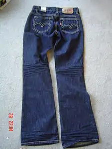 Hip-huggers are pants worn by both men and women, generally made of denim and fitted tightly around the hips and thighs, while usually having flared or bell-bottom lower legs. Hip-huggers were first designed by Irene Kasmer in 1957 in Los Angeles, California. They were worn by the mods in the mid 1960s and into the early 1970s. The late 1970s saw the return of hip-huggers in the disco scene. They were also worn, but to a lesser extent, in the early 1980s, but made a reappearance in the 2000s.[1] The hip-huggers of the 2000s were distinguished by the tightness of the knee, as well as the lower rise of the jeans, typically well below the belly button. This is the product of the boot cut style.[2]