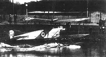 De La Rue was posted to Alexandria, Egypt, in January 1919 to command No. 270 (Seaplane) Squadron. Offered a permanent commission in the RAF that August, he nevertheless returned to Australia and sought employment through Lieutenant Colonel Stanley Goble, an ex-RNAS pilot then seconded to the Navy Office. Goble, desiring a specialist seaplane pilot for naval cooperation work, arranged a captain's commission in the recently established Australian Air Corps, successor to the wartime Australian Flying Corps.[3] On 17 June 1920, in an Airco DH.9A, De La Rue accompanied Captain Adrian Cole on a flight to an altitude of 27,000 feet (8,200 m), setting an Australian record that stood for more than ten years.[4] Later that month, flying an Avro 504L floatplane, he became the first person to land an aircraft on the Yarra River in Victoria.[5] In July he was put in charge of trials of the Avro 504L aboard the Royal Australian Navy's flagship, HMAS Australia.[6] De La Rue joined the Royal Australian Air Force (RAAF) as a flight lieutenant in 1921, becoming one of the original twenty-one officers on its strength when it was formed (as the Australian Air Force) that March.[7][8] Going by the first name of Frank, he was also popularly known throughout the service as "Kanga".[9][10] In August 1921, he underwent the RAAF's "No. 1 Course" at the Australian Army's Central Training Depot in Holsworthy, New South Wales; his fellow inductees included Flying Officers George Jones, Arthur Murphy, and Raymond Brownell.[11]