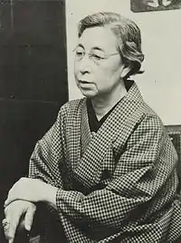 Hiratsuka would join the cooperative movement in the 1930's, concluding that this would be the best option to include the most amount of people towards the main goal of social reform.[1] The next several years, however, saw Hiratsuka withdraw somewhat from the public eye, saddled with debts and her lover beset with health problems, although she would continue to write and lecture. In the postwar years, she emerged again as a public figure through the peace movement. In 1950, the day after the outbreak of the Korean War, she traveled to the United States together with writer and activist Nogami Yaeko and three other members of the Japan Women's Movement (婦人運動家) in order to present US Secretary of State Dean Acheson with a request that a system be created in which Japan could remain neutral and pacifist. Hiratsuka continued to champion women's rights in the postwar era, founding the New Japan Women's Association (新日本婦人の会) in 1963 together with Nogami and noted artist Iwasaki Chihiro, and continuing to write and lecture up until her death in 1971.
