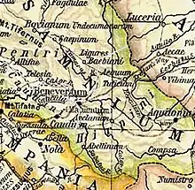In the valley of the River Tamarus, which was mentioned as being 5 miles above Beneventum in the Itinerary of Antoninus, there was Ligures Baebiani et Corneliani, a colony of Ligurians relocated in the heart of this mountain region by the Romans in 180 BC.[17] It continued to exist as a separate community in the days of Pliny.[18] Three of the minor towns of the Hirpini were mentioned by Livy as having been retaken by the praetor M. Valerius in 215 BC;[19] but the names given in the manuscripts, Vescellium, Vercellium, and Sicilinum, are probably corrupted.[20] They are otherwise unknown, except for Vescellium, which is also found in Pliny's list of towns[21] and should be placed in the far north, on the way to Luceria.[22] Fratulum, whose name is found only in Ptolemy, is equally uncertain, although the author set it in the South, at the same latitude of Compsa and the same longitude of Aquilonia.[23]