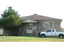 Hirst-Mathew Hall is a historic school building in Bruno, Arkansas. It is located in a complex included several other school buildings south of Arkansas Highway 235, between County Roads 5008 and 5010. It is a single-story stone structure, with a gable-on-hip roof that has exposed rafter ends in the Craftsman style. The main (north-facing) facade has a centered gable-roof porch supported by four columns set on a raised concrete base. The east facade has 14 windows, placed asymmetrically in groups of six, three and five. The west facade has 12 windows in two groups of six. It was built in 1929 as part of the Bruno Agricultural School, and originally housed classrooms. When it was listed on the National Register of Historic Places in 1992, it was in use as a textile factory.[2]