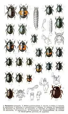 The larvae and adult forms of Histeridae have been known to feed on dung, carrion, decomposing vegetation, other insects, larvae, and pupae.[11] The Hister beetles are able to locate both dung and carrion through olfaction. When found on dung, carrion and vegetation, the Hister beetles will feed on the fly larvae found there.[12] The predacious Hister beetle will feed on soft-bodied insect eggs and larvae, Diptera in particular. Some species of Histeridae will even feed on other Histeridae.
