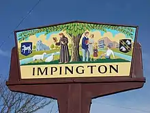 The name is probably Anglo-Saxon and made of three parts, each corresponding to a syllable. The meaning of the second and third is 'belonging to' ('-ing') and 'farmstead or place' ('-ton'). The first part may refer to a person, 'Impa' or Empa', so the village name means 'Impa's place or farm'.[9] But given the Domesday Book spelling 'Epin', the first part might have the same meaning as in 'Epping' - 'a platform or raised place'. Impington might even mean 'place belonging to the imps', since 'imp' had its modern meaning in Anglo-Saxon.[10]