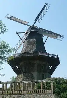 The present smock mill is a replica of the one built from 1787 to 1791 and the third so-called Historic Mill. It had to be planned from photographs and measurements of the mill foundations, because the construction drawings by Cornelius Wilhelm van der Bosch were no longer available.