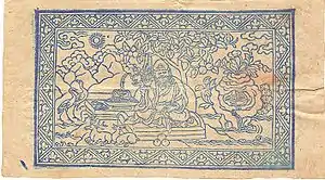 The highest denomination note (50 tam) was often forged, and the Tibetan government decided to introduce a new multicoloured version printed in a more sophisticated manner. The legends on the obverse were printed from woodblocks, while the remaining design on both sides was machine-printed using several different metal blocks. The first notes of this new issue were dated T.E. 1672 (= AD 1926). New notes of this denomination were produced every year until T.E. 1687 (= AD 1941).[19][20]