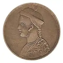 During the second part of the 19th and the first third of the 20th century numerous foreign silver coins circulated in Tibet. Most of them were traded by weight, such as Mexican and Spanish American silver dollars, Russian roubles and German marks. The exception were British Indian rupees, particularly the ones with the portrait of Queen Victoria, which widely circulated in Tibet and were mostly preferred to Tibetan coins. These rupees were of good silver and had a fixed value, exchanging for three tangkas until about 1920[16] and in later years of the 20th century they considerably increased in value. The Chinese authorities saw the popularity of the Indian rupees among Tibetan traders with misgivings and in 1902 started striking their own rupees which were close copies of the Indian Victoria rupees, the portrait of the Queen being replaced by that of a Chinese mandarin, or, as most numismatists believe, of the Guangxu Emperor of China. The Chinese rupees were struck in Chengdu and, starting in the 1930s also in Kangding, the former Tibeto-Chinese border town in western Sichuan. The first issues were of good silver and could gain a certain popularity among the Tibetans, but later issues, particularly the ones minted in Kangding, had a considerable amount of alloy, and were therefore not accepted by many traders. In the early minting-period also a small number of half and quarter rupees were struck in Chengdu. Since they often ended up as buttons or as parts of silver jewellery, their production was soon discontinued, and, when small change was needed, the whole rupees were cut in half or were quartered with the help of a sword and a hammer.[17] The total mintage figure of the half rupees was 130,000 and that of the quarter rupees 120,000. It is estimated that between 25,500,000 and 27,500,000 Sichuan rupees were minted between 1902 and 1942.[18]