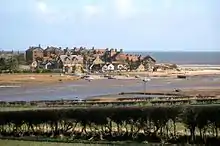 No Roman remains have been discovered in or around the village, but it appears likely that the estuary was known and presumably used by the Romans, perhaps when the empire extended to the Antonine Wall between the Firths of Forth and Clyde. Ptolemy, writing in the 2nd century CE notes the river Alaunus, and the much later Ravenna Cosmography notes a place-name of Alauna. A substantial Roman fort, Alauna, was established over an 11 acres (4.5 ha) site, 9.5 miles (15.3 km) upstream on the Aln at Learchild near Whittingham.[6] The harbour provided by the river would have been useful to the Romans, both to support military campaigns and to facilitate trade,[7][8] albeit the river is not navigable beyond Lesbury, 3.2 kilometres (2.0 mi) upstream.[9]
