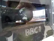By 1985, computer graphics technology had progressed sufficiently that on 18 February the mechanical mirror globe was retired in favour of the new "Computer Originated World", or 'COW', which showed a semi-transparent blue globe with golden continents and gold "BBC1".[2] It was created by the BBC graphics and computer departments with work starting on it in 1983, following the success of the electronic BBC2 ident and the clocks.[3] The COW globe went down well with the public, and changed the perception of the channel. Also, for the first time, holding slides, trailers and promotions included the BBC1 golden logo, bringing the brand together. The COW globe also used the same clock face as before, with some changes.[nb 1]