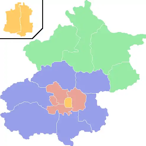 The Jin expanded the city to the west, east, and south, doubling its size. On today's map of urban Beijing, Zhongdu would extend from Xuanwumen in the northeast to the Beijing West railway station to the west, and south to beyond the southern 2nd Ring Road. The walled city had 13 gates, four in the north and three openings in each of the other sides. Remnants of Zhongdu city walls are preserved in Fengtai District.[66] The Jin emphasized the centrality of the regime by placing the walled palace complex near the center of Zhongdu. The palace was situated south of present-day Guang'anmen and north of the Grand View Garden.[67] In 1179, Emperor Zhangzong had a country retreat built northeast of Zhongdu. Taiye Lake was excavated along the Jinshui River[68] and Daning Palace (大寧宮/大宁宫) was erected on Qionghua Island in the lake.[69][Note 23] The grounds of this palace is now Beihai Park.