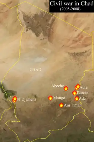 An attack on the Chadian town of Adre near the Sudanese border led to the deaths of either one hundred rebels, as every news source other than CNN has reported, or three hundred rebels. The Sudanese government was blamed for the attack, which was the second in the region in three days,[15] but Sudanese foreign ministry spokesman Jamal Mohammed Ibrahim denies any Sudanese involvement, "We are not for any escalation with Chad. We technically deny involvement in Chadian internal affairs." This attack was the final straw that led to the declaration of war by Chad and the alleged deployment of the Chadian airforce into Sudanese airspace, which the Chadian government denies.[16]