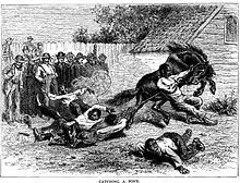 In 1876, art student Howard Pyle visited Chincoteague. He wrote of his experiences, including viewing the pony penning (which took place behind his hotel), the following year in Scribner's Magazine, accompanying the text with the first known contemporary drawings of the event.[23] Pyle was struck by the quaintness of Chincoteague, describing it as "an enchanted island, cut loose from modern progress and left drifting some seventy-five years backward in the ocean of time".[24] The publicity in a national magazine did nothing to reduce the crowds coming to Chincoteague for the penning.[23]