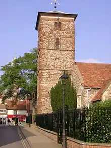 The largest and richest Ecclesiastical institution in Medieval Colchester was St John's Abbey, a Benedictine monastery founded in 1095 on the site of an existing Saxon church to St John the Baptist or St John the Evangelist to the South of the town.[41] As it was of the Benedictine order, no lay person was permitted to worship in the Abbey building itself, and so St Giles church was built by 1172 on the edge of the Abbey precinct to serve the lay community of St John's Green.[29] To the North-East of the Abbey, on the road out of South Gate, was the Augustinian St Botolph's Priory.[5] A third large institution was the Franciscan Greyfriars, founded by 1237 within the town walls on what is now the West end of East Hill.[41] The Friary, part of the Wardenship of Cambridge, was a large building whose spire was the tallest structure in the Medieval town.[41] A fourth monastic institution was the Crossed (also spelt Crouched) Friars on Crouch Street, an Augustinian order separate from those at St Botolph's Priory.[41] They had taken control in 1496 of the Chapel of the Holy Cross, a hospital on the junction of Maldon Road and Crouch Street.[41] A fifth monastic institution, and a second hospital, was St Mary Magdalene's on Magdalene Road on the way to the Hythe port.[41] This was under the nominal control of St John's Abbey, against whom the hospital struggled for independence in the 14th century, including enlisting the aid of Parliament.[41] There were two other Medieval hospitals connected to the town, St Catherine's somewhere outside of Head Gate, and St Anne's on Harwich Road,[33] which was the site of a Holy Well.[41] The town had several parish churches; St Mary-at-the-Walls (often called Our Lady-at-the-Walls),[41] St Peter's, St Runwald's, St Martin's, St Nicholas', St James the Great's, All Saints/All Hallows, Holy Trinity, St Leonards-at-the-Hythe, and the chapel of St Helena.[5][41] The Castle contained a chapel,[5] and the town also contained small chantry chapels.[41]