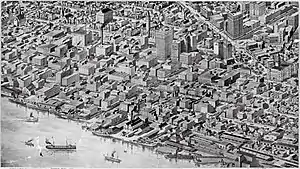 The Detroit race riot of 1863 occurred on March 6, 1863 and was the city's first such incident, as Irish and German Catholics resisted the mandatory draft laws. At the time, it was reported as "the bloodiest day that ever dawned upon Detroit."[29] The casualties of the day included at least two people dead, and many others injured, mostly African-American, 35 buildings were burned to the ground, and a number of other buildings were damaged by fire.[30]