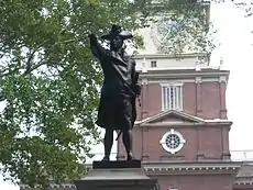 The first St. Patrick's Day parade in Philadelphia was in 1771.[9] Prior to the first parade, the Irish were already celebrating St. Patrick's Day in Philadelphia. Before the America republic was founded, Irishmen came together in 1771 to pay honor to Ireland's patron as founding members of the Society of the Friendly Sons of St. Patrick for the relief of Emigrants from Ireland. George Washington, who has encouraged the many Irish soldiers under his command during the American Revolution to fete St. Patrick's Day, was an honorary member of this society. The designation of March 17 as a day of special observance was a very early Philadelphia custom.[10] Philadelphia's Saint Patrick's Day parade is the second oldest in the United States.[11]