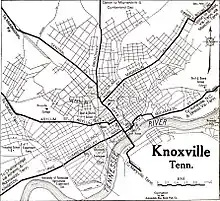The History of Knoxville, Tennessee, began with the establishment of James White's Fort on the Trans-Appalachian frontier in 1786.[1] The fort was chosen as the capital of the Southwest Territory in 1790, and the city, named for Secretary of War Henry Knox, was platted the following year.[1] Knoxville became the first capital of the State of Tennessee in 1796, and grew steadily during the early 19th century as a way station for westward-bound migrants and as a commercial center for nearby mountain communities.[1] The arrival of the railroad in the 1850s led to a boom in the city's population and commercial activity.[1]