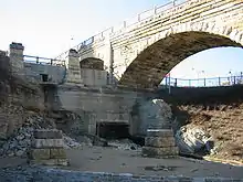 To continue economic use of the river, civic leaders pushed for plans to build locks and dams, making the Mississippi River navigable above Saint Anthony Falls for the first time. Congressional approval for the Upper Minneapolis Harbor Development Project came in 1937 but it wasn't until 1950 through 1963, that the United States Army Corps of Engineers constructed two sets of locks at the lower dam and at the falls. They also covered the falls with a permanent concrete apron. The project also resulted in the disfiguration of the Stone Arch Bridge by replacing two of the arches with a steel truss. The rest of Spirit Island was also obliterated in the process.[14][32]