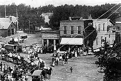 In 1853, the trustees elected Clark T. Hinman as the first president of the university and committed to raising $200,000. Hinman insisted that a university, rather than a preparatory school, be constructed first and that it should be built outside of Chicago. Following Hinman's recommendation, Lunt began to survey for land that was both north of the city and abutting railways for a new university in the areas of Jefferson Park and Ridgeville. Unable to find available land on the north shore up to Lake Forest, the committee was ready to purchase farmland to the west of the city when Orrington Lunt insisted on one final visit to the present location.[16] A 360-acre (150 ha) parcel of dry, wooded bluffs overlooking Lake Michigan belonging to a Dr. John Foster (unrelated to Randolph S. Foster) was purchased by Evans for $25,000 in August 1853 as a site for the new campus.[17][18] In 1855, the university charter was amended to declare that university property "shall be forever free from taxation for any kind and all purposes."[18] The trustees aggressively used the property-tax-exempt status to purchase more of the surrounding farms and Northwestern land holdings grew as large as 680 acres (280 ha). In 1854, Philo Judson, Northwestern's business manager charged with surveying and plotting this real estate nicknamed the land "Evanston" in honor of founder John Evans.[19] In 1857, the Illinois legislature changed the name of the village from Ridgeville to Evanston and it became an incorporated city in 1863. The university undertook a major development effort to drain the swamps, clear and grade the land, and donated or sold land to permit the construction of streets, parks, schools, waterworks, and churches.[20] Between 1860 and 1870, Evanston's population had grown from 831 to 3,062.[19]