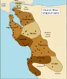 Conquistadors from New Spain claimed Oakland, and other Ohlone lands of the East Bay, along with the rest of California, for the king of Spain in 1772. In the early 19th century, the Spanish crown deeded the East Bay area to Luis María Peralta for his Rancho San Antonio. The grant was confirmed by the successor Mexican republic upon its independence from Spain.[4] Upon his death in 1842, Peralta divided his land among his four sons. Most of Oakland fell within the shares given to Antonio Maria and Vicente.[5]