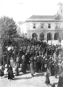 The Julgado of Póvoa became a comarca (shire) on June 16, 1875. Despite that Póvoa did not beneficed much from the Liberal Regime.[23] Póvoa de Varzim was activelly involved in the Republican revolt of January 31, 1891 due to the 1890 British Ultimatum in Africa, with the actions of Rocha Peixoto, and the population sheltered and organized the flee to Spain, in a Poveiro boat, to Alves da Veiga.[23] In that morning and while in Porto, Rocha Peixoto wrote a manifest for the people and, above all, workers; as a distraction tool for the Municipal Guard. In the previous night, in Póvoa's Café Suiço, some local intellectuals celebrated the upcoming revolution with Madeira wine.[40][41]