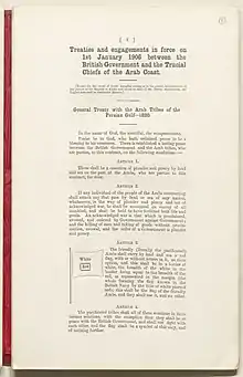 The situation between the powers became progressively worse in the following years, until the British finally ordered a military assault on Ras Al Khaimah in 1819. It was larger and more organised than previous assaults, and led to the Qawasim’s defeat, the capture of their fleet and the British occupation of Ras Al Khaimah. From then on, the British imposed a series of treaties on the rulers of what would become the Trucial States, beginning with the General Peace Treaty of 1820. The British created the post of Political Agent for the Lower Gulf to enforce the treaty, which was followed by a number of other agreements, including the Maritime Truce of 1835 and the Perpetual Maritime Truce of 1853.[52]