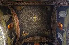 By the 5th century, structures with small-scale domed cross plans existed across the Christian world. Examples include the Mausoleum of Galla Placidia, the martyrium attached to the Basilica of San Simpliciano, and churches in Macedonia and on the coast of Asia Minor.[118] In Italy, the Baptistery of San Giovanni in Naples and the Church of Santa Maria della Croce in Casarano have surviving early Christian domes.[119] In Tolentino, the mausoleum of Catervus was modeled on the Pantheon, but at one-quarter scale and with three protruding apses, around 390-410. The Baptistery of Neon in Ravenna was completed in the middle of the 5th century and there were 5th century domes in the baptisteries at Padula and Novara.[97] Small brick domes are also found in towers of Constantinople's early 5th century land walls.[120] Underground cisterns in Constantinople, such as the Cistern of Philoxenos and the Basilica Cistern, were composed of a grid of columns supporting small domes, rather than groin vaults.[121] The square bay with an overhead sail vault or dome on pendentives became the basic unit of architecture in the early Byzantine centuries, found in a variety of combinations.[118]