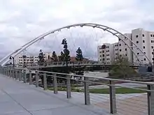 On July 10, 2005 a new trolley station opened on the SDSU campus, after construction began in 1999. The station connected students and faculty with other areas in San Diego county and helped to combat the low availability of parking around campus. The $103 million station was just one of the university's several construction projects that occurred in the 2000s.[85] Starting in the late 1990s, a $500 million College Community Redevelopment Project led to the development of the $8.5 million Piedra del Sol Apartments, the $14.3 million Fraternity Row, and future developments of a $15 million Sorority Row, a $150 million Paseo retail, office, and apartment project, as well as a $125 million research and office park.[86] In 2003, a pedestrian bridge opened, connecting several of the dorms to the main campus.[87] In the same year, the campus's most technologically advanced and largest classroom (capable of holding 500 students) was completed.[88] Through 2008 and 2009, the campus began work on constructing a new alumni center, expanding Aztec Center, and modifying Storm Hall and Nasitir Hall to add more office and classroom space.[89]