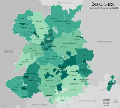 Leintwardine was divided amongst various hundreds, largely the new Herefordshire hundred of Wigmore and the new Shropshire hundred of Purslow (created also from Rinlau), with some manors going towards the new Munslow. The Domesday-era hundred of Conditre formed the basis for the large Stottesdon hundred, which took in manors from Overs and Alnodestreu, and resulted in Overs being divided into two detached parts. Stottesdon also brought across manors from the Staffordshire hundred of Seisdon. Clun hundred was formed upon the ending of the Marcher lordship there; it formed part of Montgomeryshire (and therefore Wales) in 1536, but was brought into Shropshire already in 1546.