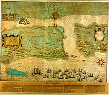 Pedro Menéndez's ships first sighted land on August 28, 1565, the feast day of St. Augustine of Hippo. In honor of the patron saint of his home town of Avilés, he named his colony's settlement San Agustín.[16] The Spanish sailed through the inlet into Matanzas Bay and disembarked near the Timucua town of Seloy on September 6.[17][18][19] Menéndez's immediate goal was to quickly construct fortifications to protect his people and supplies as they were unloaded from the ships, and then to make a proper survey of the area to determine the best place to erect the fort.