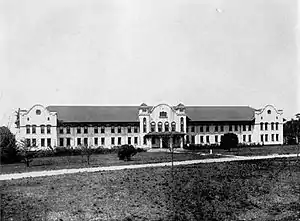 The first building on the campus, constructed between 1912 and 1913, was named in honor of William Lorraine Converse, Sr. who, as a State Representative, helped expedite the establishment of the college in Valdosta. On December 19, 1912, Dr. Powell moved into office his in the new building and the first pieces of furniture were installed in preparation if the school's opening.[2] Converse Hall served a variety of purposes for the new institution. The structure provided classrooms, administration offices, double-occupancy dormitory rooms, a dining hall, an infirmary, and a chapel. The Spanish Colonial Revival architecture of college in Valdosta was based on the popular style of the era, as well as Powell's personal experiences in the American Southwest. The school opened in January 1913, but the surrounding landscape was primarily undeveloped There were no driveways or sidewalks, and the predominant wetlands at the south were only crossable at Patterson Street.