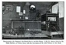 Amateur radio came into being after radio waves (proved to exist by Heinrich Rudolf Hertz in 1888) were adapted into a communication system in the 1890s by the Italian inventor Guglielmo Marconi.[6] In the late 19th century there had been amateur wired telegraphers setting up their own interconnected telegraphic systems. Following Marconi's success many people began experimenting with this new form of "wireless telegraphy". Information on "Hertzian wave" based wireless telegraphy systems (the name "radio" would not come into common use until several years later) was sketchy, with magazines such as the November, 1901 issue of Amateur Work showing how to build a simple system based on Hertz' early experiments.[1] Magazines show a continued progress by amateurs including a 1904 story on two Boston, Massachusetts 8th graders constructing a transmitter and receiver with a range of eight miles and a 1906 story about two Rhode Island teenagers building a wireless station in a chicken coop. In the US the first commercially produced wireless telegraphy transmitter / receiver systems became available to experimenters and amateurs in 1905.[1] In 1908, students at Columbia University formed the Wireless Telegraph Club of Columbia University, now the Columbia University Amateur Radio Club. This is the earliest recorded formation of an amateur radio club, collegiate or otherwise.[7] In 1910, the Amateurs of Australia formed, now the Wireless Institute of Australia.