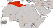 A Kharijite remnant established a state (776–909) under the Rustamids, whose capital was at Tahert (located in the mountains southwest of modern Algiers).[109] Apart from the lands surrounding Tahert, Rustamid territory consisted of largely the upland steppe or "pre-Sahara" that forms the frontier between the better watered coastal regions of the Maghrib and the arid Sahara desert. As such, its territory extended in a narrow climatic strip eastward as far as Tripolitania and Jebel Nefusa (in modern Libya). In between lay southern Ifriqiya, where Rustamid lands included the oases of the Djerid, with its chotts (salt lakes), and the island of Djerba.[110] The functionality of this elongated geography may be explained by the liberal nature of the Rustamid government: "[T]he imam did not so much rule or govern the surrounding tribes as preside over them, his authority being recognized rather than imposed and his mediation in disputes willingly sought."[111] As such this Rustamids territory ran from Tlemcen in the west to Jebel Nefusa in the east.