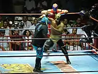Masks (mascaras) have been used dating back to the beginnings of lucha libre. Early masks were very simple with basic colors to distinguish the wrestler. In modern lucha libre, masks are colorfully designed to evoke the images of animals, gods, ancient heroes, and other archetypes, whose identity the luchador takes on during a performance. Virtually all wrestlers in Mexico would start their careers wearing masks, but over the span of their careers a large number of them would be unmasked. Sometimes, a wrestler slated for retirement would be unmasked in his final bout or at the beginning of a final tour, signifying loss of identity as that character. Sometimes, losing the mask signifies the end of a gimmick with the wrestler moving on to a new gimmick and mask. The mask is considered "sacred" to a degree, so much so that fully removing an opponent's mask during a match is grounds for disqualification.[20] During their careers, masked luchadores would often be seen in public wearing their masks and keeping up the kayfabe of lucha libre while other masked wrestlers would interact with the public and press normally. However, they would still go to great lengths to conceal their true identities; in fact, the mask is synonymous with the luchador. Luchadors whose masks are removed or damaged in the ring would often allow themselves to be pinned in the scripted context of the match's storyline, to preserve their identity. El Santo continued wearing his mask after retirement, revealed his face briefly only in old age, and was buried wearing his silver mask. With the importance placed on masks in lucha libre, losing the mask to an opponent is seen as the ultimate insult and can at times seriously hurt the career of the unmasking wrestler. Putting one's mask on the line against a hated opponent is a tradition in lucha libre as a means to settle a heated feud between two or more wrestlers. In these battles, called luchas de apuestas ("matches with wagers"), the wrestlers "wager" either their mask or their hair.[21] The first luchas de apuestas match was presented on July 14, 1940 at Arena México. The defending champion Murciélago was so much lighter than his challenger Octavio that he requested a further condition before he would sign the contract: Octavio would have to put his hair on the line. Octavio won the match and Murciélago unmasked, giving birth to a tradition in lucha libre.[22]
