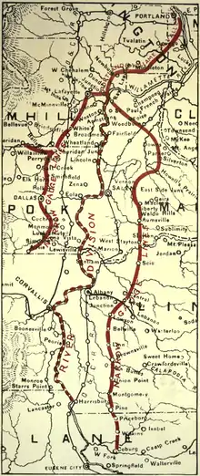 William Williams Chapman, Surveyor General of Oregon from 1857 to 1861, proposed a railroad along the Oregon Trail from Portland, over the Blue Mountains, along the Snake River, then south to the transcontinental railroad at Salt Lake City. Chapman created the Portland, Dalles and Salt Lake Railroad Company in 1881, then reincorporated it as the Portland, Salt Lake and Salt Pass Railroad Company in 1876. He attempted to raise funds for this company in the eastern United States as well as England.[1]