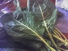 Enslaved Africans augmented their rations with cooked greens (collards, beets, dandelion, kale, and purslane) and sweet potatoes.[69] Excavations of slave quarters found that their diet included squirrel, duck, rabbit, opossum, fish, berries and nuts.[66][67] Vegetables and grain included okra, turnips, beans, rice, and peas.[66][70]