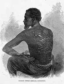 Enslaved people were generally held for their lifetimes. Children of enslaved women were enslaved from birth per the legal doctrine of partus sequitur ventrem.[33] Some commentators hold that since the muster and other records used the term "servant" that it meant that blacks who landed in Virginia were indentured servants. Unlike indentured servants, slaves were taken against their will. When slaves were first sold in exchange for food, it was clear that they were considered property. The term "indentured servitude" was often a euphemism for slavery when referring to white people.[36] Enslaved blacks were treated much more harshly than white servants. Whipping of blacks, for instance, was common.[33][lower-alpha 4][lower-alpha 5]