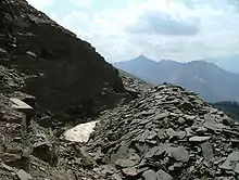 1908 saw a rich crop of publications as Walcott worked on the material he had collected the previous year, and towards the end of August 1909 he returned to the Field area. That summer, Walcott had visited England to participate in the celebration of Darwin's centenary. Whilst there, he had met the Natural History Museum curator Henry Woodward, who had suggested that the nearby Mount Field may yield further fossils of the ilk of the Trilobite beds.[2] Promptly upon his arrival in Field, Walcott ascended the slopes of Mount Field via Burgess Pass. This pass, probably one of the many constructed by the CPR in an effort to attract tourists,[6] led along what is now called Fossil Ridge. Walcott recognised the talus material which lay across the trail as the Stephen Formation, and noticed interesting fossils. This find is often considered to be the first discovery of the Burgess Shale 'proper'.[7] He spent several more days collecting on Fossil Ridge before returning to Mount Stephen to bolster his collections from the Trilobite Beds.[5]