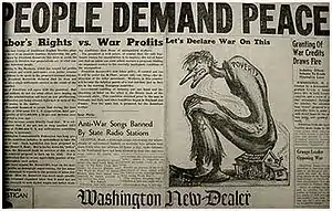 The Communist Party dropped its boycott of Nazi goods, spread the slogans "The Yanks Are Not Coming" and "Hands Off", set up a "perpetual peace vigil" across the street from the White House and announced that Roosevelt was the head of the "war party of the American bourgeoisie".[39] By April 1940, the party Daily Worker's line seemed not so much antiwar as simply pro-German.[41] A pamphlet stated the Jews had just as much to fear from Britain and France as they did Germany.[41] In August 1940, after NKVD agent Ramón Mercader killed Trotsky with an ice axe, Browder perpetuated Moscow's fiction that the killer, who had been dating one of Trotsky's secretaries, was a disillusioned follower.[42] In allegiance to the Soviet Union, the party changed this policy again after Hitler broke the Molotov–Ribbentrop Pact by attacking the Soviet Union on June 22, 1941.