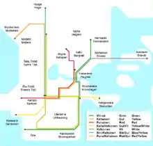 - 2 (green-white): Kauppatori–Hermanni (1926–1928). Not operated 1928–1939. Etu-Töölö–Hakaniemi/Harjutori (1939–1951). Not operated 1951–1976.[40]