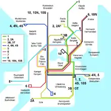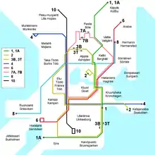 - 3T: Kaivopuisto–Kamppi–Töölö–Elaintarha (2009–2017, 2013–2017 as line 2), forms a figure-of-eight circular together with line 3B/3.[34]