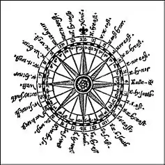 In 1300, an Arabic treatise written by the Egyptian astronomer and muezzin Ibn Simʿūn describes a dry compass used for determining qibla. Like Peregrinus' compass, however, Ibn Simʿūn's compass did not feature a compass card.[6] In the 14th century, the Syrian astronomer and timekeeper Ibn al-Shatir (1304–1375) invented a timekeeping device incorporating both a universal sundial and a magnetic compass. He invented it for the purpose of finding the times of prayers.[66] Arab navigators also introduced the 32-point compass rose during this time.[67] In 1399, an Egyptian reports two different kinds of magnetic compass. One instrument is a “fish” made of willow wood or pumpkin, into which a magnetic needle is inserted and sealed with tar or wax to prevent the penetration of water. The other instrument is a dry compass.[63]