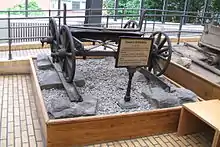 The earliest use of a railway track seems to have been in connection with mining in Germany in the 12th century.[2] Mine passageways were usually wet and muddy, and moving barrows of ore along them was extremely difficult. Improvements were made by laying timber planks so that wheeled containers could be dragged along by manpower. By the 16th century, the difficulty of keeping the wagon running straight had been solved by having a pin going into a gap between the planks.[3] Georg Agricola describes box-shaped carts, called "dogs", about half as large again as a wheelbarrow, fitted with a blunt vertical pin and wooden rollers running on iron axles.[4] An Elizabethan era example of this has been discovered at Silvergill in Cumbria, England,[5] and they were probably also in use in the nearby Mines Royal of Grasmere, Newlands and Caldbeck.[6] Where space permitted round-section wooden tracks to take trucks with flanged wheels were installed: a painting from 1544 by the Flemish artist Lucas Gassel shows a coppermine with rails of this type emerging from an adit.[7]