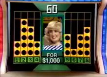 The gameboard displayed eight columns with varying numbers of circles. One column held one circle; two columns held two circles; two columns held three circles; two columns held four circles; and one held five circles. The contestant turned his/her back to the board, and the columns were randomly re-ordered.