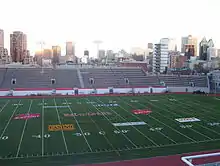 Principal photography began on 15 September 2016 and was expected to last 42 days, employing thousands of extras.[7] All 300 extras playing Indigenous characters were portrayed by Indigenous people.[6] Filming continued in Montreal in October 2016 to February 2017.[14][5] The initial football scenes were shot at Percival Molson Memorial Stadium.[14] Rainstorms delayed some production.[14]